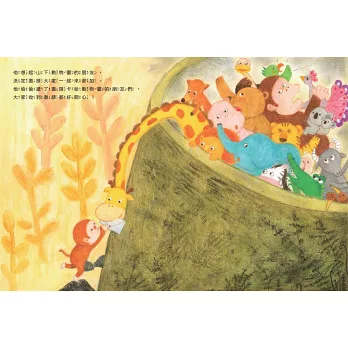 大拉頁與開門頁雙設計,結合18種動物穿上各種可愛服裝,一起找找看長頸鹿、大象、孔雀、奇異鳥在哪裡呢?