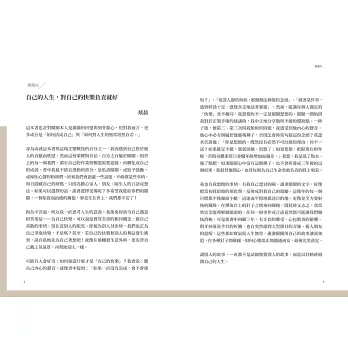 因為辛苦過,所以我一直思考人生的意義。我後來得到令自己滿意的答案是——為自己快樂。可以說是貫穿全書的相同概念:做自己喜歡的事情、別在意別人的眼光。即便為別人付出時,我們也正為自己爭取快樂,不是嗎?甚至,若自己的快樂和別人的利益發生衝突,請自私地先為自己著想吧!就像在飛機發生意外時,要先替自己戴上氧氣罩,再幫助別人一樣。