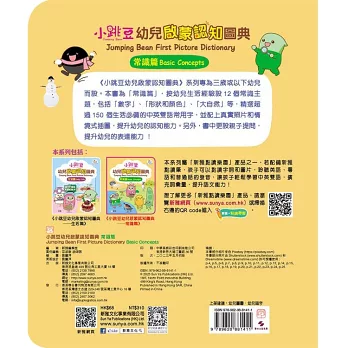《小跳豆幼兒啟蒙認知圖典》系列專為三歲或以下幼兒而設。本書為「常識篇」按幼兒生活經驗設12個常識主題,包括「數字」、「形狀和顏色」、「大自然」等,精選超過150 個生活必備的中英雙語常用字,並配上真實照片和情境式插圖,提升幼兒的認知能力。另外,書中更設親子提問,提升幼兒的表達能力 !
