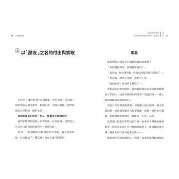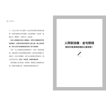平時看似朋友多,但以「朋友」之名的索取卻讓你為難到懷疑人生?這些用人情要你幫的「小」忙只會讓你失去原則、慣性討好,作者分享禮貌又體面地拒絕別人請求的話術技巧,再進一步說明朋友的功能性與階段性,揀選出非必要的網路社交、消遺型聚會、不對等的聚會應酬,把過多的社交做分類。