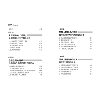本書陪你正視「自己需要的關係究竟是什麼」,透過書中的話術技巧、場景故事,輕省地清理掉多餘且有毒的關係。分為七個階段: