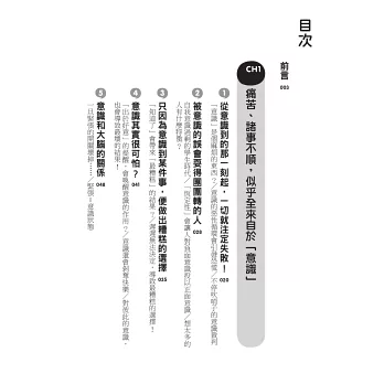 在這本書裡,我將透過淺顯易懂的方式,說明意識和無意識的差別,並傳授各位在面對人際關係和工作,以及日常中的所有情況時,該如何驅使無意識發揮作用。希望像我一樣「想太多的人」,都能靠著無意識的作用,讓自己過得更輕鬆一點。