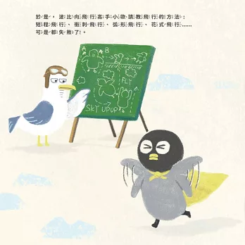 企鵝波比想飛,透過神奇的魔法讓自己可以飛起來,但是心裡出現好多懷疑自己的聲音:「我真的可以飛起來嗎?」最後發現,原來真正的魔法,是相信自己。——曾心怡 (臨床心理師)