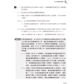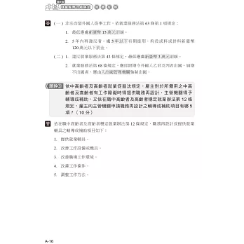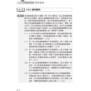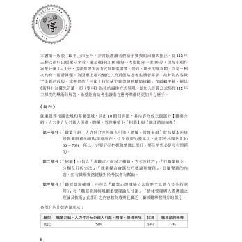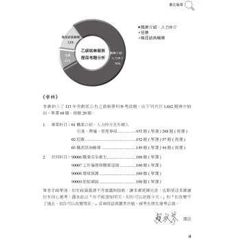 以就業服務相關法規為主軸撰寫,配合考題說明重點提示,考題共出10大題問答題,其內容分成三個部分: