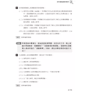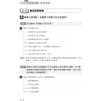 包含『職業心理測驗(含重要工具簡介及分析運用)』、『職涯發展與規劃重要理論及技術』、『情緒管理與人際溝通之理論及技術』,此部分內容較為專業且廣泛,屬較難掌握得分的部分。
