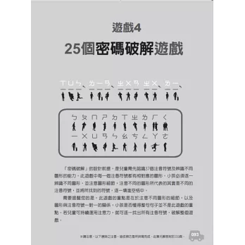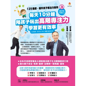 孩子的世界就是玩的世界,藉由好玩的遊戲來培養孩子的專注力,才是最有效率的做法!但別忘囉!遊戲進行中要適時的給予孩子肯定及鼓勵。•用對方法,孩子自然專心:以「選擇性注意力」概念為出發點,設計出一連串注意看、注意聽、注意細節的遊戲。