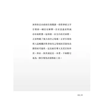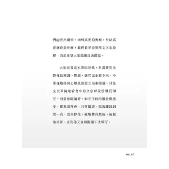 大家在看這本書的時候,只需要完全將你的知識、思維、感官完全放下來,不要採取任何心態及預設立場來閱讀,只是完全單純地看書中的文字以及引導頁即可。而當你閱讀時,如有任何的體會與感受,都無需理會,只管閱讀。如果閱讀到某一頁,完全停住,就順其自然地、放鬆地停著,直到你又自動閱讀下去即可。