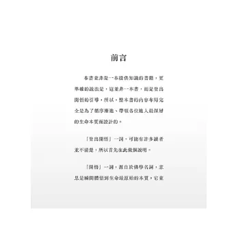 本書並非是一本提供知識的書籍,更準確的說法是,這並非一本書,而是登出開悟的引導,所以,整本書的內容布局完全是為了循序漸進、帶領各位進入最深層的生命本質而設計的。