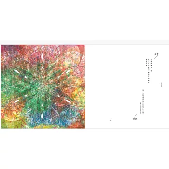 至於生命之花,是一種古老的神聖幾何圖騰,廣泛出現在東西方文化中,它象徵著宇宙原初的形狀和振動頻率,連結著生命的本源。蕭郁書試圖透過生命之花與色彩,逐一詮釋這十一條個體性通道獨特的能量頻率,成為十一張美麗的生命之花。每一張圖都配著兩句話,一句是憂鬱的煎熬,將書本轉個方向讀,則是一句人生創造。如江鵝所說,「自由與禁錮是光與影的關係,無論如何旋轉頁面,那都是同一朵生命之花,同一種個體性。要用哪個面向看待生命,我們可以選。」