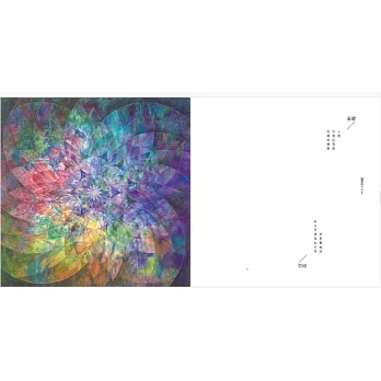 這本畫冊專為這些充滿張力的時刻所繪製。構成生命之花的規律圓弧,也有人稱為「神聖幾何」,每當我凝視生命之花,會感受到體內的能量以頭腦不能理解的方式,得到引導與校準。畫家蕭郁書運用她在能量與色彩上與眾不同的敏銳感受力,將人類圖裡11條個體性通道的特性化為色彩,填進生命之花的幾何放射當中,就好像,我們體內炙熱煎熬的突變張力,渴望在人間找到得以實現創造的途徑。畫冊裡的每一張生命之花,都配著兩句話,一句是憂鬱的煎熬,轉個方向則是一句人生創造。自由與禁錮是光與影的關係,無論如何旋轉頁面,那都是同一朵生命之花,同一種個體性。要用哪個面向看待生命,我們可以選。