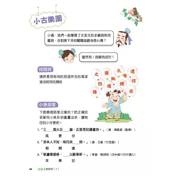 最值得一提的是,這套書雖然內容是介紹一些比較生冷的語法知識,但由於編者志在通俗,舉例說明力求適合中小學學生,用語淺近易懂,娓娓道來,只覺得輕鬆不見嚴肅。書中除了引介古籍及歷屆考題中常出現的字詞、名句外,並提供許多趣味橫生的小故事,穿插許多詼諧幽默的情境插圖,這也使本書內容更顯得活潑生動有趣。 我們相信只要父母師長善加指引, 孩子一定可以祛除對文言文畏難心理,通曉文言文常見規律,覺得文言文其實並沒有那麼困難、可怕,甚至願意進入古人世界,與古人對話,掬取古人智慧,陶養心靈,提升自我。