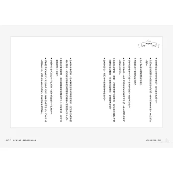 ★260則實用問題:針對每一篇主題對讀者提問,藉由問題帶入個人情境,創造屬於你的思考空間,釋放困在體內的情緒與能量。