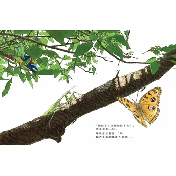 「就著晨光,行在林間,跟著兄弟倆的話語指引,循蹤覓鳥。 在樹幹與枝葉的二維構圖裡,繪者以蟲鳥的躍動與穿梭,繽紛、立體了畫面。 翻頁間,隨著日的移動、光的變化 ,領略時的流轉~在清朗與迷離的光影間,共感 生命的奮力與生生不息。」──物事文化工作室 葉青華