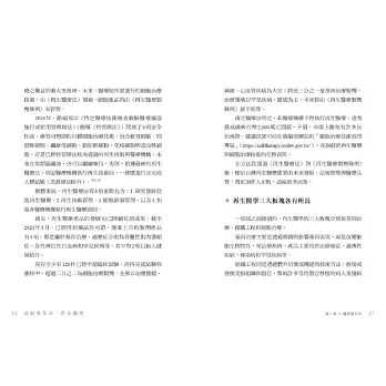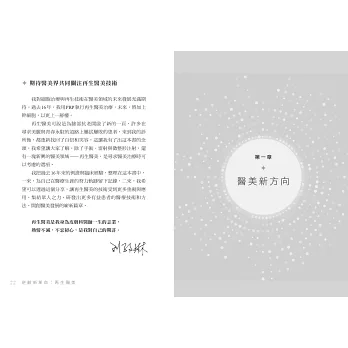 本書旨在分享新知,幫助讀者瞭解再生醫學的發展概況、再生醫美的新風貌,以及再生醫美的特色與未來展望,讓民眾在醫美療程上可以多一個選項。───────杏美皮膚科診所院長 林長熙