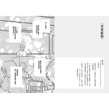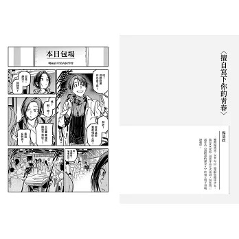 〈擅自寫下你的青春〉用甜美回憶述說最難忘的遺憾。戛然而止的青春,永遠無法親耳聽見的心意,注定是不能癒合的傷。有些人,有些事,往後就只能存在於記憶中。楊基政老師在《請聽我的聲音!!》的細膩筆觸,以及充滿細節的畫面設定,在這篇故事中依舊完美呈現。