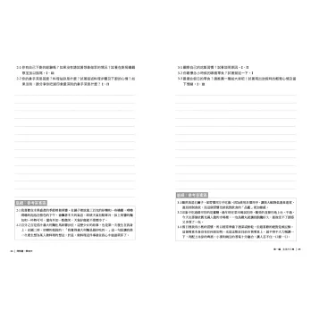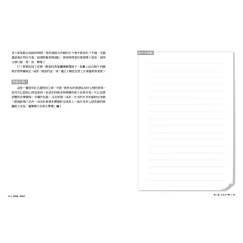 本書共有15個主題,每個主題包括「主題說明」、「問題引導」、「底細:參考答案區」、「示範短文」、「希望你更好」、「寫作見習區」等。你可以挑選自己喜歡的主題,先閱讀主題說明,再進行問題的寫作,包準會有意想不到的收穫。