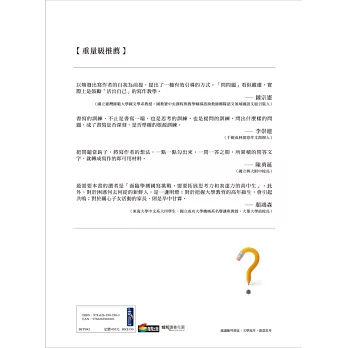 而討論和寫作是提升閱讀成效的利器。讀到佳句,除了記下來,也試著短文寫作,多讀多寫,自然會多想,想久了就會融通成自己的思維系統,對於事情也更有獨立的見地。此時,書就是活的,可為你所用。林香伶教授這本問題寫作書,告訴讀者的不只方法、示例,還有豐富實用的引導問題。很適合常常不知如何下筆的讀者熟讀運用。