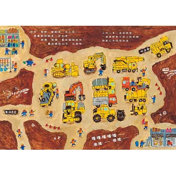 注意安全,全力以赴!為小朋友建造出最棒的童年吧!還記得小時候第一次看到壓路機的驚訝:「哇!那個輪子也太大了吧!好酷。」一邊看這故事,彷彿可以聽到小朋友們看到這些工程車時驚訝大叫的樣子。吊卡車、起重機、挖土機、推土機、翻斗車,這些巨型工具真的每臺都讓人讚嘆不已。跟小朋友一起看,你們一定會發現更多有趣的彩蛋。