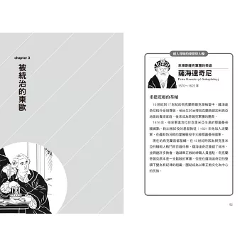 ◎全書依時間脈絡分8個章節,各章均附小專欄,介紹吸血鬼原型、軍團團長、抗俄將領與文學家等東歐名人。