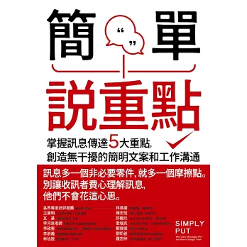 從豐富的經驗出發,班傑明‧古特曼提供經過檢測的實戰技巧,以放大有效溝通最重要的特質:簡單明瞭。以這本書為指引,你將學會如何果決和有效地溝通。強烈推薦《簡單說重點》給所有想抓住重點的人!——Joel Schwartzberg Get to the Point作者