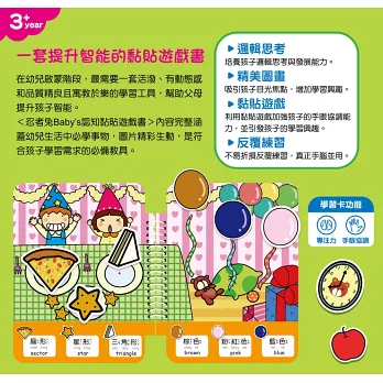 希望孩子主動學習,就要讓他們先愛上學習。本產品結合了黏貼遊戲及閱讀認知兩大功能,不僅滿足孩子「好玩」的感覺,更在反覆遊戲中「學會」許多生活情境應用語詞,同時增加中文、英文的語文能力。而且,除了愉快的親子互動時間外,獨立學習也沒有問題!