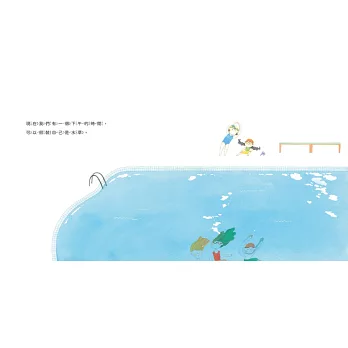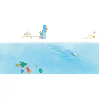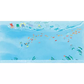 戴上蛙鏡,潛入水下,舉起雙手,左搖搖,右晃晃,跳一場美麗的水草舞。抱著雙腿,憋著氣,站在泳池底,學海底的小石頭保持安靜。啊,氧氣不夠了,快浮上水面!大吸一口氣,縮頭、屈膝,在池子裡上上下下,現在是水母漂啊漂。咦,這個泳池好像不一樣了⋯⋯隔著蛙鏡看出去,人們變成魚,聚成一大群,在身邊繞來繞去,你往東牠們也往東,你往西牠們也跟著往西⋯⋯