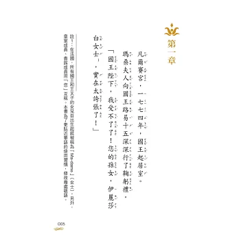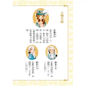 ◎以真實人物、背景為架構。從中一窺法國史上最輝煌的王朝,還有賦予歷史人物鮮明的個性。讓讀者能夠學到許多關於宮廷生活以及真實歷史事件的知識。