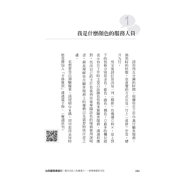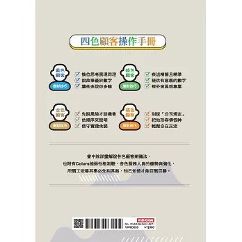 書中除詳盡解說各色顧客辨識法,也附有Colors強弱性格測驗、各色服務人員的優勢與強化,所謂工欲善其事必先利其器,知己知彼才能百戰百勝。