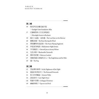 我心裡有個疑問:也許吧?但為什麼不至少加一個「樂」混合一下?恰巧,我決定把我為笠詩社60週年紀念寫的一首詩〈深夜食堂〉放進這本詩集─我在那首詩裡借用了弘一法師臨終前寫的「悲欣交集」四個字。在我的理解裡,悲傷與喜悅像兩股繫得緊緊交纏的繩子,形成一股生命的軸。