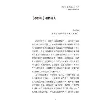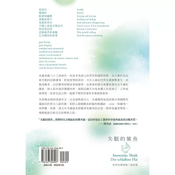 許萍芬是詩人,這是我以前沒想到的——以前我只知道她是文化方面的策展人。她曾受臺灣駐德國大使謝志偉的委託,組織團隊幫我拍攝過描述香港淪陷的詩歌朗誦影片《二次屠殺》,也曾主持過臺灣駐柏林使館歡迎美麗島抗議事件的英雄之一陳菊訪歐。我們有過相當多的交往——萍芬有無數的可能性變換無數的稱謂,可我唯一沒想到她是一個詩人,竟然用詩行來記錄自己的日常生活,靈氣十足,天分足夠,比如「失眠的鯊魚」這個題目,就讓我很意外。因為只有「失眠的鯊魚」才將暫時迷失嗜血的攻擊本能,這剛巧道出了叢林世界弱肉強食的冷酷本質。