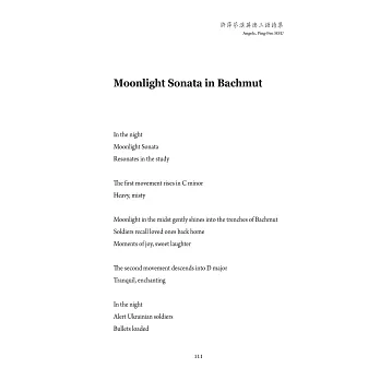2022年到2024年,在新冠疫情結束前,世界上發生了許多人禍天災,俄烏戰爭,以巴衝突,還有摩洛哥地震等。我住在柏林,看到不少烏克蘭人在此流亡,學習,或是工作,有時候跟他們對話時,會想這個世界怎麼了。我為此寫下幾首詩:〈巴赫姆特的《月光奏鳴曲》〉,〈陽台上的最後一朵玫瑰〉,〈地鐵正義〉,〈被退回的明信片〉,〈黑夜裡的噩夢〉。