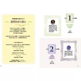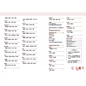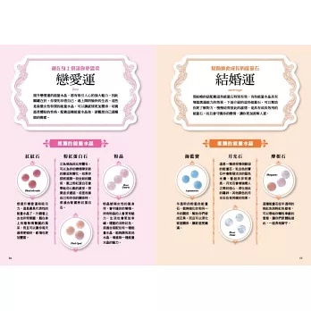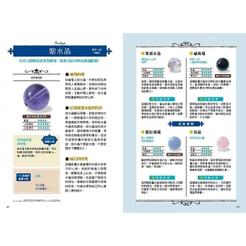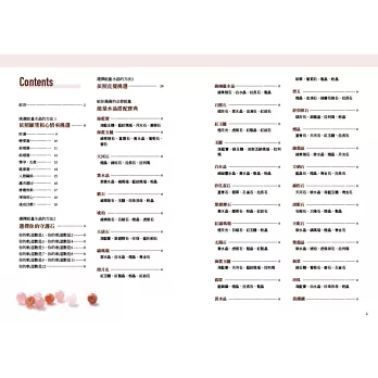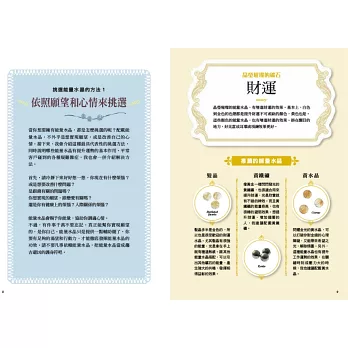 關於配戴水晶總是會有各式各樣的問題,該戴左手還是右手?什麼樣的水晶可以互相搭配,而什麼樣的水晶搭在一起反而會抵銷效果?常見水晶的功效是什麼?想增進財運、戀愛運、工作或人際關係該戴什麼水晶?怎麼淨化水晶,多久要淨化一次?在本書中,這些問題都能在書中找到解答。近年來十分流行的生命靈數手串,在書中也提供快速上手的方式,找出自己的生命靈數對應水晶。