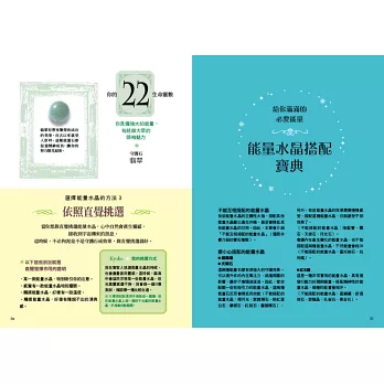 能量水晶能讀懂主人的想法。光是戴在身上是不夠的,正確的使用方法才是關鍵。瞭解擁有特殊能力的寶石特徵及組合方式,發揮多種能量水晶搭配的最大效果,能量更強大,幫助您顯化心願的速度更快。