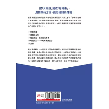 不論是職場新人,還是想在現有領域獨闢蹊徑的管理者,都可以從中學到實用的思考框架和技巧,讓工作更加高效。——甘劍平,知名投資人、渶策資本創始人