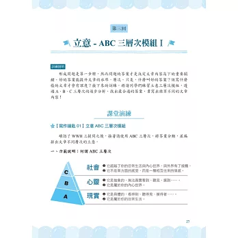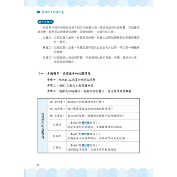 身為現場教師的我,經常發現孩子寫作時腦袋素材空洞貧乏,詞語句法單調缺乏變化,或者長篇大論,卻言不及義,毫無章法重點。然而,小王子昌瑋老師的模組,不僅能在短時間建立起孩子寫作架構的思考路徑,更能培養孩子的思辨能力,讓他們對生活情境更能深刻思索。作為小王子模組愛用者,WWH審題三提問和ABC立意三層次,是我作文教學和寫作後回饋分享最喜歡使用的策略。在學生寫作前,我使用三提問來深化學生內容的深度,並以ABC立意三層次作為檢討作文時讓學生自我檢核的參照規準。昌瑋老師更將新型態作文命題分成三類:基本圖表題、數據分析圖表題、情境分析圖表題,並強調問題意識與C層次「社會」進行連結,強調解決問題的歷程讓自己有所成長,也提醒學生,應思考自己的文章對生活環境或社會大眾有何貢獻和價值,時刻銘記肩負的一份社會責任。