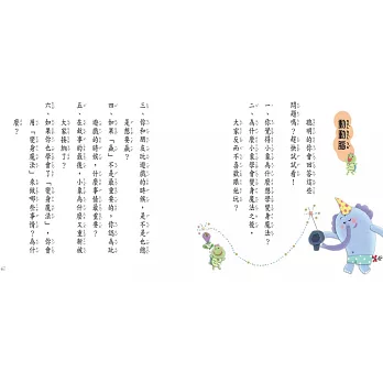提醒您,每個故事後面還附加思考問題或創意遊戲,提供親子共讀或班級集體閱讀之用,非常方便實用又有趣味。