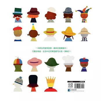 ★這本色彩繽紛的書,說的不只是戴在頭上的「帽子」,每一頁還充滿奇思妙想和想像力。「橡實可以變成溫暖你手指的小帽子。」「如果只是一下子,泡泡可以做成非常漂亮的帽子。」從具體到充滿想像,書中的文字和插圖都在鼓勵孩子發展創造性思維,邀請他們翻轉對帽子的既定印象。「只要你相信,任何東西都可以是帽子。」每一頁圖文都蘊含著翻轉思維,幫助孩子用創意的眼光觀察周遭的世界。各種圓臉的大人和孩子插圖,讓人想起克里斯汀.羅賓遜(Christian Robinson,美國兒童讀物插畫家和動畫師)的風格,對讀者來說,是很吸引人的畫風。孩子們一定會喜歡坐在充滿泡泡的大浴缸中洗澡,以及手舞足蹈開心地戴著睡褲、毛巾做成的帽子的角色。這本書非常適合在故事時間或課堂上分享,孩子們可以為自己或周遭的世界,創造出各式各樣富有創意的帽子或其他服飾。讀完令人感到非常愉快。──《學校圖書館期刊》(School Library Journal),約翰.斯科特(John Scott)