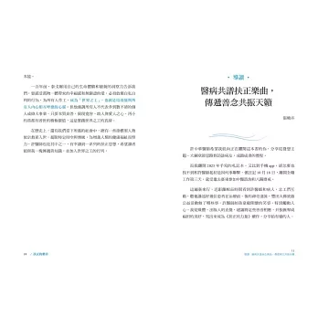 音樂無處不在,當音符從你我耳邊飄過,就像郵差送來一封信,上面寫著「扶正的樂章」,大家放輕鬆來聆聽本書樂曲,從一位很特別、身上長著巨大腫瘤的修行者開啟奇幻行腳的序曲,再來是癌症全方位中西治療的協奏曲,接著將這些年來累積的學術科學與臨床療效故事連結,傳統醫學與現代科學的共鳴曲,最後是身心淨潔與善相應,善善相應的扶正樂曲。