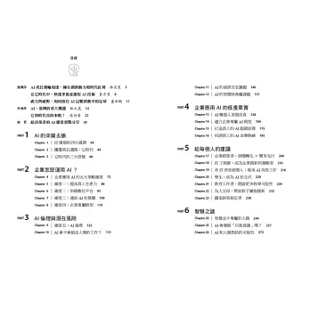 有別於其他AI書大多著重在未來趨勢和技術觀念上,這本書提供了深入且實際的企業應用AI 指南,其內容包括: