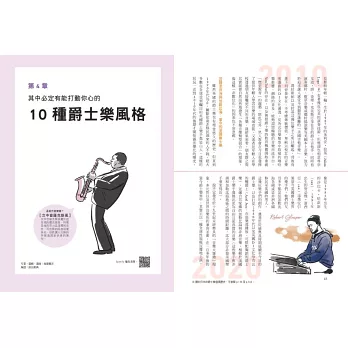 「爵士樂非常神奇,它不斷自我成長、進化。精彩的演出,就像一則生活小故事,隨時讓你回味無窮。從傳統到最時尚的爵士動態,一覽無遺。看過才知道,電影、漫畫當中爵士樂竟然如影隨形的存在。這本書提供各種參考角度,讓讀者不只是閱讀,而是感受神奇的經驗。」──傅慶堂/資深爵士樂迷、Bravo FM091.3 電台主持人