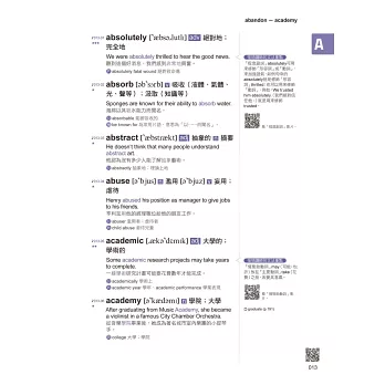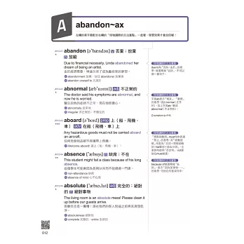 遇到不會的單字別擔心,全書依照A-Z的字母順序編寫,再加上右頁的右上角皆有標示該頁的單字範圍,就像英文辭典的查找功能,幫你快速找到自己想學的單字。
