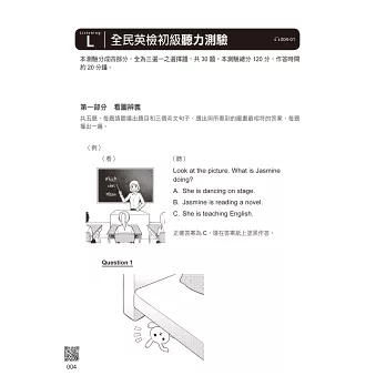 聽力:看圖辨義、問答、簡短對話、短文聽解