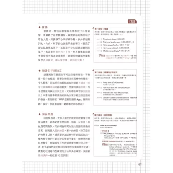 有別於坊間書籍將單字與文法打散,或是用一整頁的篇幅去解釋英文文法,本書以「左欄單字例句補充」、「右欄重點文法說明」的設計,解決了讀者無法將文法和單字正確運用在例句中的難處。