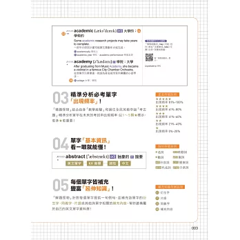 書中標記能「前尋」或「後找」的單字和頁數,就像電腦的Ctrl+F搜尋功能一樣方便!因大部分讀者只對第一頁和最末頁的單字印象最深,透過單字右欄的單字頁數提示,幫你真正達到全書預習和複習的效果。