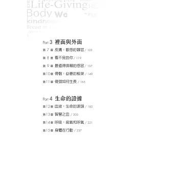 透過結合《神的形像》和《神的傑作》兩本前作,經過重新編輯與資料更新,他們引領讀者展開一趟引人入勝的身體之旅,從描繪皮膚、骨骼、血液、神經系統的巧奪天工,到探索許多靈性議題,比如紅血球、白血球與血小板如何合作分工,賦予「基督的身體」新的概念;從人體血液如何滋養全身細胞、清理代謝物,重新詮釋基督流出寶血的意涵。