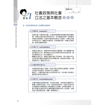 老師的課本採用大量的表格編排,在各章開頭以及內文都有大量的重點提示,方便考生以最快的速度進入狀況,另外搭配老師部落格的時事整理,輕鬆掌握該科出題的方向,若能適當引用在作答當中,更能達到加分的效果,高分勝出!