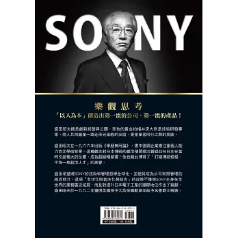 日本經營四聖之一的盛田昭夫(一九二一年~一九九九年)大正10年出生於名古屋。從大阪帝國大學物理系畢業後,盛田昭夫進入一家研究所,並認識了未來的商業夥伴井深大。一九四六年,盛田昭夫與井深大一同創辦了東京通信工業株式會社。