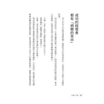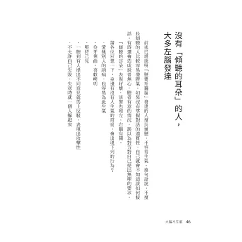 2.透過對專業人士的腦部掃描,得知不生氣的秘訣,與生氣的「方法」:專業人士大多「聽覺系腦區」發達,善於聆聽與理解他人語句,然而在必要時也能透過冷靜地斥責來引導事情往正確的方向前進。本書將會透過腦科學與實際觀察,告訴你如何透過腦科學進行情緒管理,使事情能更順利進行。
