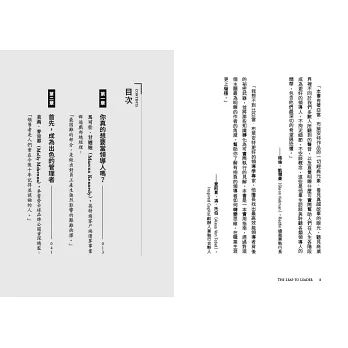 「亞當.布萊安特寫出了易於閱讀的『羅塞塔石碑』,指引人們如何應對躍升為領導人的挑戰,這需要頭腦和心靈的共同努力。本書將在這兩個領域給予你重要實用的建議。」──唐納德.諾斯(Donald R. Knauss),高樂氏(Clorox)前執行長
