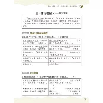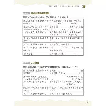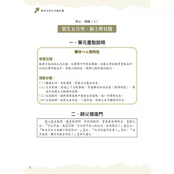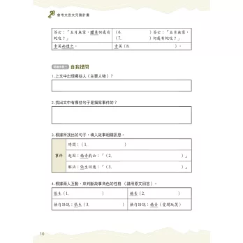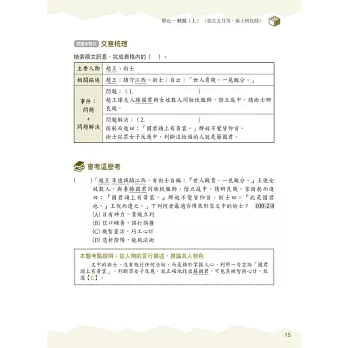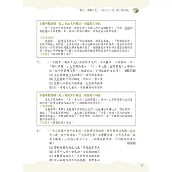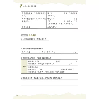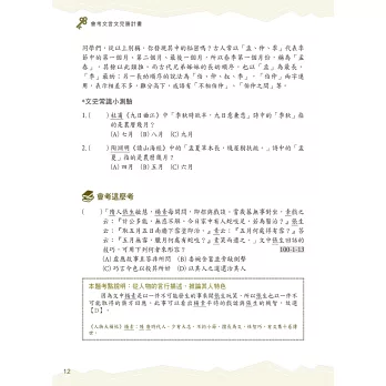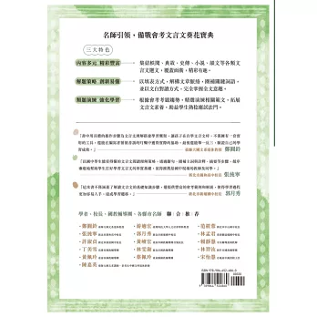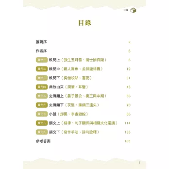 書中除了理解文意的訓練之外,還希望能帶領同學一步步學會由文章中摘重點、推論作者旨意並進一步學會表達自己的觀點;同時利用文史常識開外掛的小單元,讓同學對文言文的理解不但加深,還能加廣。